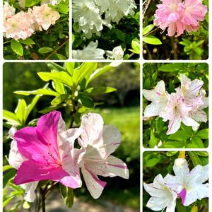 湖周りのお花 1️⃣ツツジ ピンク🩷白♡のお花の咲いている木に、霜降りやピンクのさしの入ったお花が咲いています 歩道の近くは大輪のヒラドツツジが咲いています 山の方のには小ぶりの花が咲いています ツツジかサツキ?アザレアか? サツキは5〜6月に開花です 2️⃣ツツジ❓ 3️⃣カナメモチ(要黐) 葉の芽吹きが真っ赤でお花の様です 4️⃣ツバキ(椿) この時期、薄暗い林縁に咲き出す斑入りのお花 5️⃣モッコウバラ(木香薔薇) 優しい黄色がいいですね