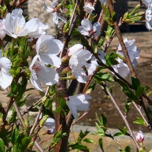 【ユスラウメ(梅桃、山桜桃梅)】 中国原産、バラ科サクラ属落葉低木 春、梅や桜に似た美しい花を枝いっぱいに咲かせる。 花には、5裂した先の尖った卵形のがく片・花びら5枚・おしべ多数・めしべ1本が見られる。 6月頃になると、真っ赤な小さな果実を実らせる。白い実を付ける白実ユスラウメもある。 ユスラウメの名は、花が梅の花に似ていること、枝の上部に繁茂して風が吹くと揺れやすいことからついた。 樹高:2~3m 開花期:3月下旬~4月上旬 花色:白~淡紅色 picは白実ユスラウメ 自宅の小さな庭