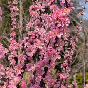【ユスラウメ(梅桃、山桜桃梅)】 中国原産、バラ科サクラ属落葉低木 春、梅や桜に似た美しい花を枝いっぱいに咲かせる。 花には、5裂した先の尖った卵形のがく片・花びら5枚・おしべ多数・めしべ1本が見られる。 6月頃になると、真っ赤な小さな果実を実らせる。白い実を付ける白実ユスラウメもある。 ユスラウメの名は、花が梅の花に似ていること、枝の上部に繁茂して風が吹くと揺れやすいことからついた。 樹高:2~3m 開花期:3月下旬~4月上旬 花色:白~淡紅色 picは白実ユスラウメ 自宅の小さな庭