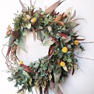 リースつくりました 先日頂いたユーカリをベースに春っぽく♪ 家にあるものでも可愛くできて大満足です🙌 キウイの蔓 ユーカリ 小さい葉っぱ ユーカリ 細長い葉っぱ ミモザ クラスペディア ドドナエア ラグラス ノゲイトウ ユキヤナギ 綿花 モミジバフウの実 ユリ
