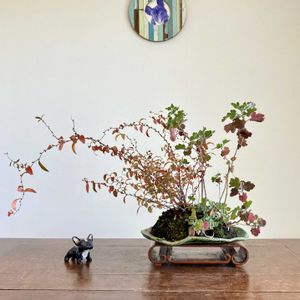 雪柳と小菊の寄せ植えです。雪柳はこの秋最後の紅葉です。小菊は蕾はあるのですがなかなか咲きません。 This is a mixed planting of snow willows and small chrysanthemums. The snow willows are the last to turn red this fall. The small chrysanthemums have buds but are not blooming yet. 🍁