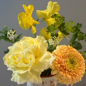 コデマリ🤍 ラナンキュラス🧡 カーネーション🩷 ユリ💜 ネコヤナギ🤎 スイトピー💜 ゴージャス🥰💐