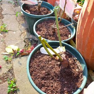 こんばんは 今日は久しぶりの雨☔️ アジサイ用に雨水溜めているのでバケツや受け皿総動員でした バラの花は傷んだかも ①ベビーアイスバーグ 秋バラ1番花なので10月終わり頃の写真です ②11/21の写真 今も数は少なくなりましたが咲いてくれてます♪ しかし先日家族が2階のベランダにキャンプ用品を干した時にオモリ?を落として、庭に置いていたこの子に直撃、枝が3本根元からポッキリいってしまってました😱😭 かなしい‥ 来年またいい枝が出てくれますように🙏 ③おまけの ラ ドルチェヴィータ 寒いこともあり花持ちすごくいいです💕 ④ミニバラモカ 夏剪定しそびれて一部カットくらいしかできず‥ 今頑張って咲いてくれてます