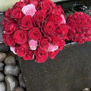 近所の神社⛩️ 花手水舎のアレンジが変わってました🌹 華やかな赤とピンクのバラ🩷 今回もステキです❣️