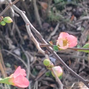 ボケ バラ科ボケ属 落葉低木 中国原産 日本には平安時代に渡来した。 帰化植物であるが、本州、四国、九州にかけて植栽されているが、一部は野生化している。 名前の由来は、果実が瓜に似ており、木になる瓜で「木瓜(もけ)」と呼ばれたものが「ぼけ」に転訛したとされる。または、「木瓜(ぼっくわ)」から「ぼけ」に転化したとも言われる。 花期11〜3月 葉が芽吹くより先に径2.5〜3.5cmの5弁花を咲かせる。 様々な品種があり、花色は淡紅色、俳紅色、白と紅色の斑、白色などがある。 11月頃から咲く花は、春に開花するものと区別するために「寒木瓜(かんぼけ)」と呼ばれることもある。 ①② 1/6 散歩コースにて ③ 12/17 花の池公園にて