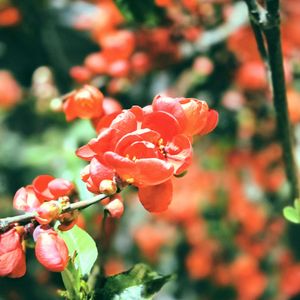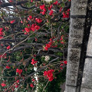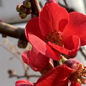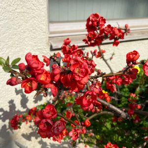 こんにちは 暖かいですねー ボケの花 今年もよく咲いています