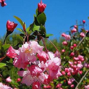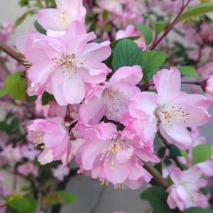 『艶麗』『美人の眠り』『温和』『友情』。「艶麗」「美人の眠り」は、ほろ酔い加減で眠そうにしている美しい楊貴妃の姿を、皇帝が「海棠(かいどう)の眠り未だ足らず」と評したという故事に由来しています。桜のあとに咲き始める、花色の美しい植物です。