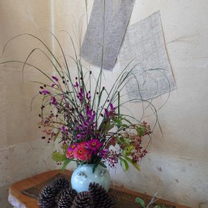 今日は知り合いの方たちが開催されたパッチワーク展を見に行ってきました·͜· ꕤ︎︎ どれも力作ぞろい( *´艸`) でも私の目に飛び込んできたのはෆ.*・゚ たくさんの多肉ちゃんの寄せ植やモルタルデコetc. 生け花の吾亦紅とそこに置かれたアケビ いい感じでした✌