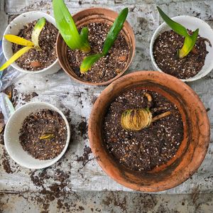 去年ご近所から大量に頂いた君子蘭。蕾にオレンジ🧡出て来ました。 去年玄関先まで大きな植木鉢を運んでくれたおじさん…昨年急に体調崩され亡くなりました…大事に育てようと思います🥲 先日カーメン君の動画で、春植え球根の紹介があったせいかお迎えしようと思って楽天でカゴに入れといた球根…1日放置していたら全部売り切れてました😱 動画の影響ってすごい😱 DCMに行ったら売ってたパイナップルリリーだけ手に入れて来ましたよ。 今日は一日雨だったので玄関で鉢に植えつけました👌🏻 ルピナスの自家採取したタネを先週花壇に蒔いたら芽がいくつか出て来ました。去年は咲くまでにはいかなかったので今年は咲きますように✨
