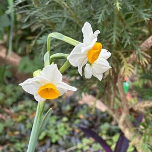 日本水仙 もう咲いてます🤍💛🤍。 背景はネギ畑 〜近所にて〜