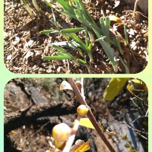┏ アレッ。 ┛ロウバイの つぼみ が。😄 🔸🍂かきわけたら スイセンが ここにも ‼️。 咲くのは マダマダ だけど うれしい発見。