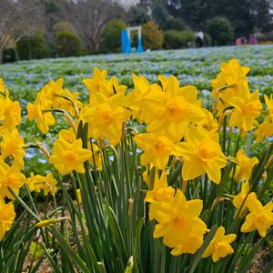 🏷️月曜日は元気色の花 後ろに広がってるのはネモフィラ畑 満開まではもう少しだったけど ブルーの絨毯広がってます 🏷️青い花で春浪漫2026 🏷️街の青い花を写そう!2026