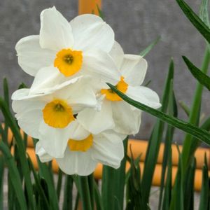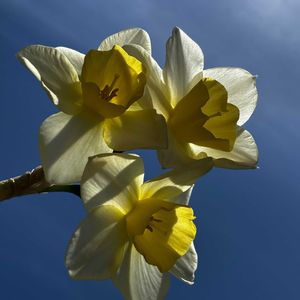 水仙と春の空。 この水仙、黄花の球根に混じっていたのですがこの後褪色して白くなります。 しかも去年まで1輪咲きだったのに今年は小さい花が3つも。 もう4年目になるのに毎年違う姿を見せてくれます(笑)