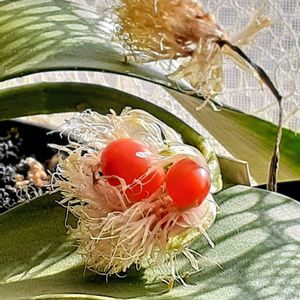今日のお花 オモト と、言うことで、マユハケオモトを♪ マユハケオモト(眉刷毛万年青) ヒガンバナ科 マユハケオモト属 常緑性 南アフリカ原産 花期10〜11月 シロバナ品種の果実です。 2024/2/1撮影 ③④は2024/10/9撮影