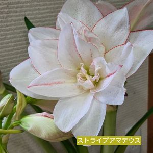 *アマリリス* 白い八重のアマリリス、ストライプアマデウスが咲いてくれました。 2枚目、白 ピンクの共演、部屋が華やかです。 3枚目、デッキは 初雪です。❄️❄️