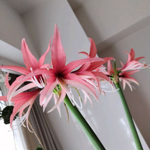 アマリリス ピンクサイビスター 元はマジックアマリリス 咲き終わってから去年の春に土に植え無事に咲きました✨ 咲いてくれてありがとう😊