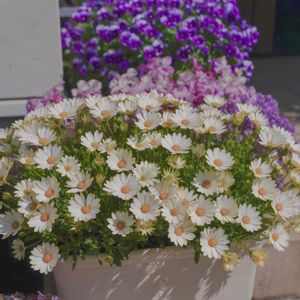 💛🤍キララホワイト🤍💛 サントリーフラワーズの オステオスペルマム 花弁の表が白🤍、裏が黄色💛 蕾が黄色💛なのに、 お日様が当たって開くと白🤍 この変化が好きです💕 夏越し、冬越しをして 一株で沢山開花してます✨✨