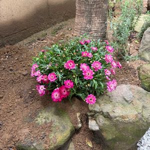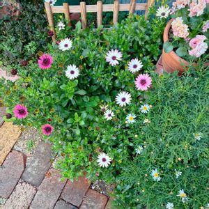 オステオスペルマムꕤ HCでgetしたのと三ツ星品質だったかな(?) 去年の春に狭いとこに5株も植えたので窮屈そう…4株生存確認👀 レンガ小道に這って来たらバッサリcut…✂️ ボンザマーガレットꕤ ガーデニング始めたての頃購入した親株の挿し木っ子(適当に地面に刺しただけ) 残念ながら親株は去年の猛暑で枯れちゃったけど…挿し木は頑張って巨大アフロ化…!アフロも少しcut✂️
