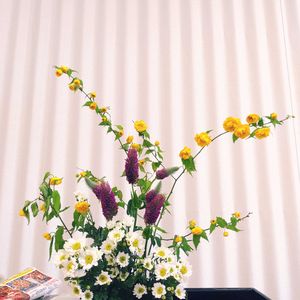 お稽古で使わなかったお花や、持って帰って来たお花を家で生ける時、そのままの形で生けるときもあれば違う形で生ける時もあります。 このお花を一つ前にupした立花新風体のお花を、家で自由花に生けなおしです。 立花は特にワイヤーを掛けてるので、傷みやすく花材の強さにもよりますが、もう一度立花として生けるのが難しいです。 そんな訳で自由花です。 お気に入りの軒丸瓦に生けました❣️