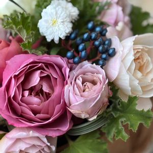 ①今日の花遊び教室は、BOXフラワーを作りました。 最近寒いので庭のお花が咲いてくれるかなー?と 心配しましたが、朝起きたら咲いてくれてました〜 ②お1人は、「今日の朝の占いで黄色🟡がラッキーカラーだった」と黄色をメインに。 ③バラ「いおり」が好きな方は、くすみカラーで。 ④ピンク🩷がお好きな方はピンクをメインに。 ⑤朝から何度も庭に出てちょこちょこ花を摘んで来るのが、私の楽しみです。 今、大好きなビバーナムティヌスの実が重宝します。