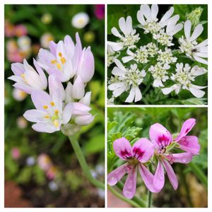 ⬅️アリウムロゼウム 🩷️うっすらピンクの花が愛らしい。 わずかずつ増えてます。 ↗️🤍オルレア 白い小花がたくさんでひとつの大きな花みたいに見えます😄 こぼれ種で毎年咲きます。 ↘️🩷️ローズゼラニウム 他のゼラニウムはなかなか定着せずに 枯れてばかりいますが このゼラニウムは強くて 元気に枝を伸ばしてます! もう、ほかのゼラニウムは諦めました😆 蚊連草とか言って蚊が嫌う匂いらしいけど? どうなのかな🤔