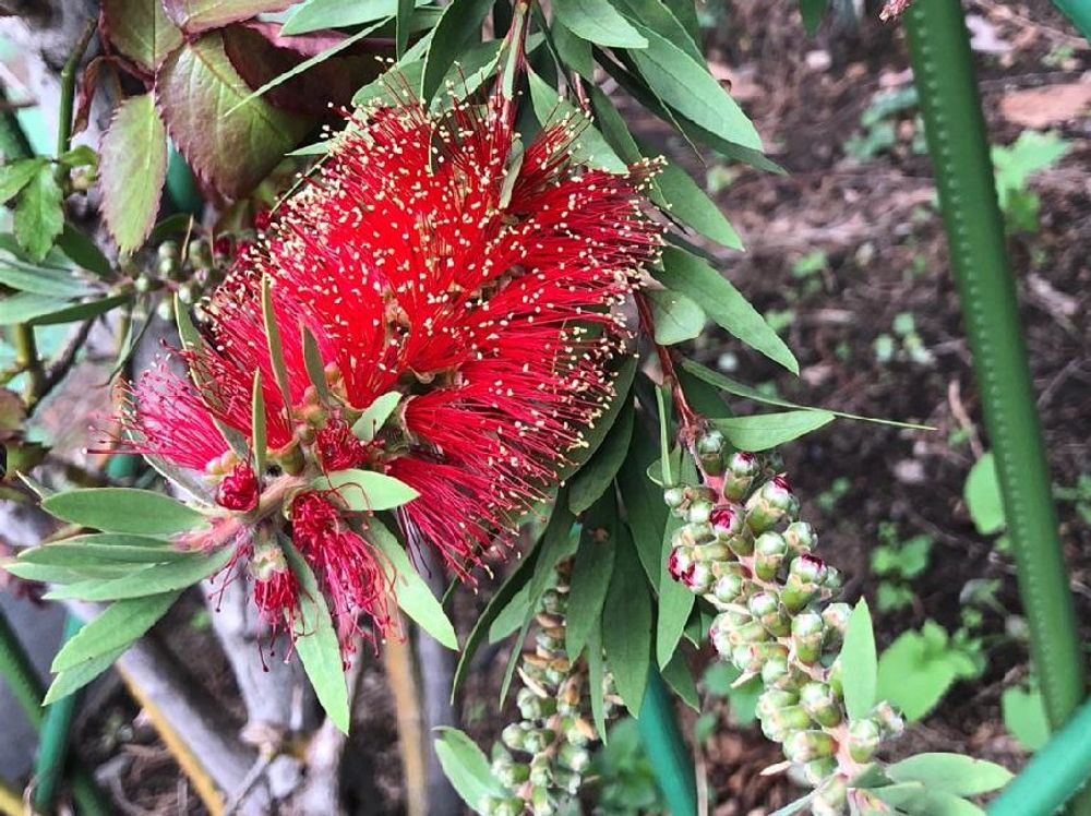 原産地のオーストラリアでは、ブラシノキが咲く夏場には乾燥による山火事が多く発生します。その時に果実が裂けて中の種子が風によって飛散することで子孫を増やしていくのだそうです。花は開花後すぐに落ちてしまい地面には真っ赤に染まります。そのようなことが「はかなく燃える恋の火炎」を連想させるのかもしれませんね。