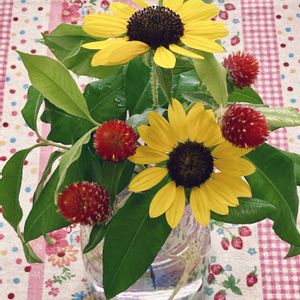 剪定したレモンマートルの枝と… 庭の千日紅とひまわり(アポロン)🌻 どちらも茎が伸びすぎたものをカット✂️ 庭の株もこんもりしてくれれば一石二鳥👍レモンマートルにも根が出るといいな☺️