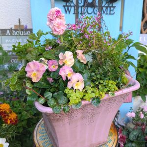 可愛い明るいピンクのお花が欲しいわね💕と母が言うのでパスフリと八重咲きストック、キンギョソウ(秋の寄植えからの使い回しで今は咲いてないけど)、クフェア、ティアレラで寄植えしました。 グリーンはその辺からハツユキカズラやナツメグゼラニウムなどを抜いてきた😆