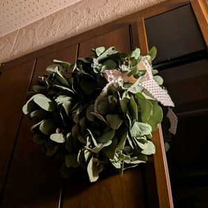 ユーカリのリースにリボン付けて、玄関に飾ってみました。よきよき😇