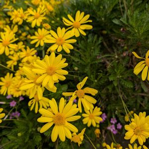ユリオプスデージー ギョリュウバイ💕 下水道インフラ工事現場の入り口でユリオプスデージーが満開でした🤗💕 その横に…再び「自由にお持ちください」の花苗がたくさん😄👍️💕💕💕 「公園に植えま〜す!」と声をかけて頂いてきました〜👍️💕 欲しかったギョリュウバイ💕💕💕 調べてみると…マヌカハニーの花!白い花! 蜂🐝が寄ってくる🧐 これは園芸品種のピンクなので、🐝が来ることはない! でも、ピンクでも🐝が来る!とAIが言ってる😓 公園花壇は公共の場所なので、危険要因は無くさないといけない😖 なので、好きな花だけど、泣く泣く戻してきました😭😢 今日明日は公園で「肉フェス」やってますよ〜😋! 2026.4.25