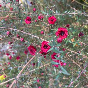 おはようございます(˶ᐢᗜᐢ˶) 。…*❁: 。 今日のお花 。:❁*… 。 🌸 ギョリュウバイ🌸 🍯マヌカハニーの木 🍯 綺麗な 鮮赤色の マヌカ🪴 霜 🌀 寒風が 苦手な子なので 気をつけなくちゃ❁⃘*.゚ 穏やかな日で ありますように 🍀𓂃◌𓈒𓐍