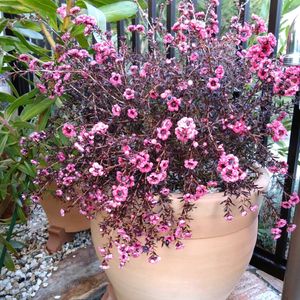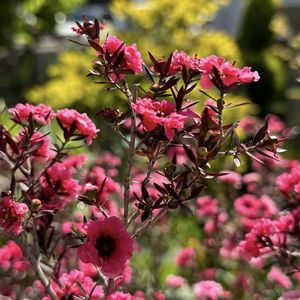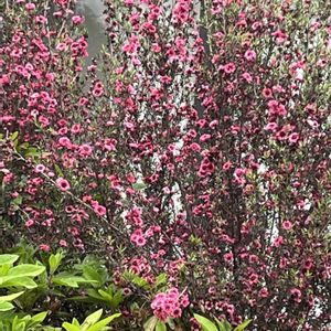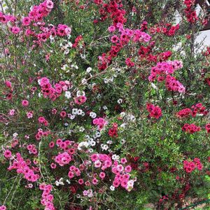 今日のお花 🌱 ギョウリュウバイ🌱 フトモモ科 2025 年4月16日~5月4日撮影です。 ❺の実は5月28日撮影 細い枝を蜜に生やし、その枝に小さな可愛い花を沢山つけます。 我が家の八重咲き御柳梅は1本の木に赤、白、ピンク色でとても賑やかです。 ギョウリュウバイとマヌカの違い マヌカツリーは白い花が咲く亜種で、ギョリュウバイの中の一種だそうです。 「マヌカ」という名前はアオリ語、ニュージーランドの先住民族が古来大切にして来た薬木の呼称です。 マヌカハニーはニュージーランドのみに自生するマヌカツリー(1月の数週間)から採れたとても希少な蜂蜜だそうです。