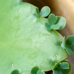 マザーリーフ (セイロンベンケイソウ) 久し振りに芽出ししました😊 10年程前ハワイの空港✈️で、余ったドルで購入した植物 袋に葉が2枚入ってました 同時にプルメリアの枝も購入しました マザーリーフはハワイ由来ではないと分かり、テンションが下がり少し放ったらかし状態でした 冬も外でしたが耐えて育ってました 今回強風で葉が飛んでいたので久し振りに芽出ししてみましたよ (風で葉を飛ばすのは繁殖方法だと思われます🤔) 鉢皿に水を張り浮かべる(沈んでもok)だけ、10日位で葉のギザギザ部分から芽が出て来ます😊 冬に花が咲くようですが大株にしなくてはいけないので、まだ見ていません😅
