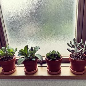 窓際族 しかも洗面所 もう置く場所が、ね‥ しかし、ダイソーさんの3個100円鉢は本当に助かる🤗 「逆光な」 「」