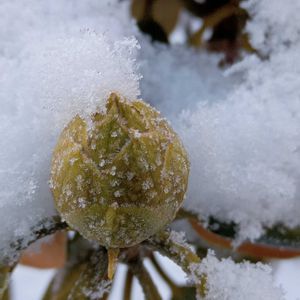 ❄❄❄ 雪の朝 5月に 咲く 1️⃣ シャクナゲの蕾 秋に 蕾を付けて 半年以上 咲く時を 待ってます 🌼🍀🌼 2️⃣ 元気なアブチロンの蕾 また 膨らんできました 🌕🟢🌕