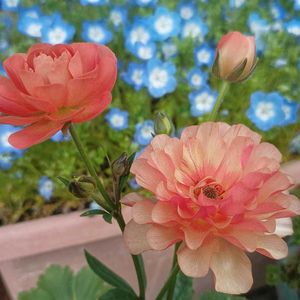🍀おはようございます🍀 ラナンキュラス ラックス エリス❣ 濃いオレンジ色から サーモンピンクに変化してきて🎶 ღ .:*・゜♡゜・*:.ღ 種蒔きネモフィラもだいぶ 開いてきました♬ ④このレウイシアも 白や濃いピンクと同じで 真夏の酷暑でのダメかも…からの 嬉しい復活🎶🎶🎶 ⑤シャクヤクにも 小さな蕾ができています🎶