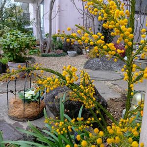 矮性の秋咲きミモザ ゴールデントップ🙂🙂🙂 切った枝を、よく目に付くけど寂しい場所に、昨日挿してみました😆🤭 植えてあるゴールデントップの枝は、隣の敷地に飛び出し、高いところはよく見えず、植えてある場所も見に行かないと目に付きにくいから… 切って挿してみた😁 お花すぐ萎んじゃうだろうけど、それでもよく目に付くところにあると、すご〜く可愛い🤗💞 年末、ご近所さんの👵玄関前の小さな花壇を作ってあげたのだけど、水仙の花が終わって色味が少なくなったので、そこにも小さな枝をそっと挿してきた🤫😁😆 気付いてくれるかな〜😙
