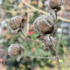 おはようございます。 快晴のお正月2日です。 ちょっと寒いんですけど😅 氏神さんの境内で咲いている花は ないかなと探してみたら ムクゲの花の後(実かな) 陽射しをあびて煌めいてました。