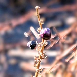 今日は寒い一日でした 凍った池の端の斑入りヤブランの実は 紫と黒でシワシワになりました もう1株の実は落ちて無くなっていました 寒空を見上げると 利休梅の実が沢山見えました 庭の奥の木槿の幹を見ると ニョロニョロ虫のように見えたのは これも冬芽と葉痕でしょうか? 🏷️グリーンアクセサリー♪