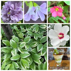 ①↙️斑入りの葉っぱが美しい ↘️いつものカフェで「シャインマスカットのブリュレパフェ」 ②木槿(ムクゲ)八重がいつもよりお花が多くて💜(案外暑さに強いのか) ③綺麗な薄紫のオキザリスもあちこちに👍 ④ラッキークローバーのお花がまたまた咲き始めた(朝晩少し涼しくなったせいかな?) ⑤白のムクゲもまだまだ元気で満開