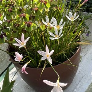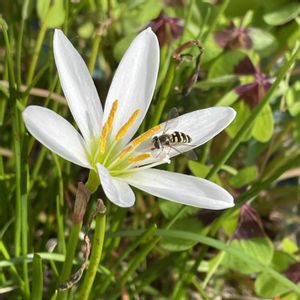 2025年 10月 8日(水) 12時 12分 撮影 屋上組さん〜 今日の お花◌ ͙❁˚ 🌿 タマスダレ chan お写真を撮ろうと 近づくと ハチさんが𓂃˚‧ ⚪️🐝⋆゜♡ カワイイ ☺︎︎︎︎