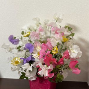 お裾分けいただいたスイートピーと庭のオステオスペルマムのアレンジ😊