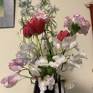 こんにちは😃 今年最初の生け花💐 春の花材がきました😃💕💕 めんこいチューリップちゃんとスイートピーの香りに癒されながら、先生や先輩生徒さんたちと話しが弾みました😊🎶🎶