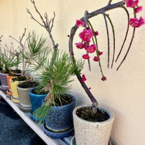 今日のお花はウメなので、我が家の開花中の枝垂れ梅の盆栽です。
