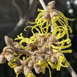 マンサク 一泊旅行から戻ったら、まぁ万作が咲き出していました。^_^ 🎗️リボンを垂らしたような愛らしい形が好きです😊 冬時雨も蕾が開いて来ました。 仮温室のテラスで花は小さくなりましたが、ハイビスカス🌺が毎日咲きます。 風は冷たいですが、陽ざしは節分の今日を感じさせます。 アーチに下げたビオラが居間の窓からいつも眺められて可愛い😍 マイガーデン🪴