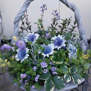 ギャザリング講座にて🌿 パープルの花いろいろの ナチュラルスタイル寄せ💜 生産終了してた綱木紋の鉢が新綱木紋として復活したそうですね 重厚に見えて軽くて丈夫で機能性とデザインがギャザリング界隈で人気の鉢 白い鉢は古い我が家には似合わないので私だけグレーの鉢です