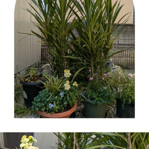🏷️今日のお花 ドラセナ 冬は庭で防風林のような ドラセナ コンシンネ ① 東側の前には 寄せ植え 黄色いストック💛 ピンクのサザンクロス🩷 ② 西側には 春待ちの梅🏵️ 花海棠🩷 ブルーベリー🫐 三鉢 ⬆️今 庭で一番元気な山茶花❤️ ③ 梅子ちゃんも ツボミが膨らんできました💕