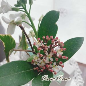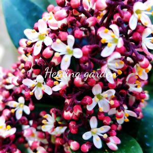 スキミア 小さな小さなツボミが開花 かわいいお花が咲き始めます。