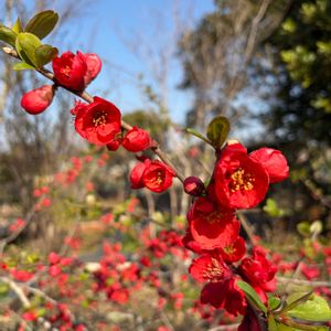 春の嵐。 咲いたね。 ①黒椿 ナイトライダー 濃赤が美しい。夜パシャ📸 ②一昨年小さな苗を道の駅でもらった 咲き分け花桃。今年1個だけ咲いた。 ③木瓜 一昨日 沢山咲いてたのに 鳥に食われたか残り2個になり それから大風に飛ばされてしまった。儚い夢。 ④お気に入りなのに なんでか調子が上がらないスキミア。でも咲いた。