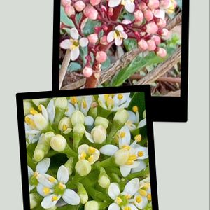 スキミア 小さい植木鉢でよく倒れます 今年は沢山花が咲きました 2枚目 全体 3,4枚目 別のスキミア 葉っぱがすっかり落ちてるのに花がついてます